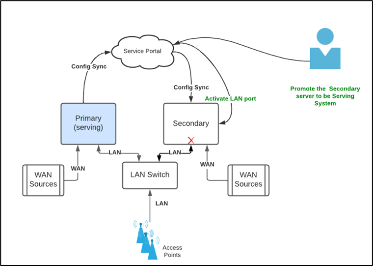 For the HA feature to work successfully, both Primary and Secondary servers have to be connected to the Internet. The configuration between the servers is periodically synced and LAN ports are active/enabled only on the Serving System. When the primary server/serving system fails, user can promote the secondary server to be the serving system by logging into EpicLink.