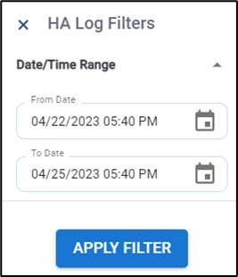 Click APPLY FILTER button to view the HA Log history between the selected time interval.
