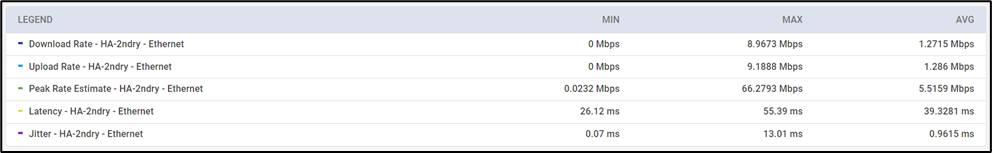 The Legend provided below the Chart helps the user to differentiate between the various types of metric values plotted in the chart. It also shows the Minimum value, Maximum value, and Average value of the selected metric.