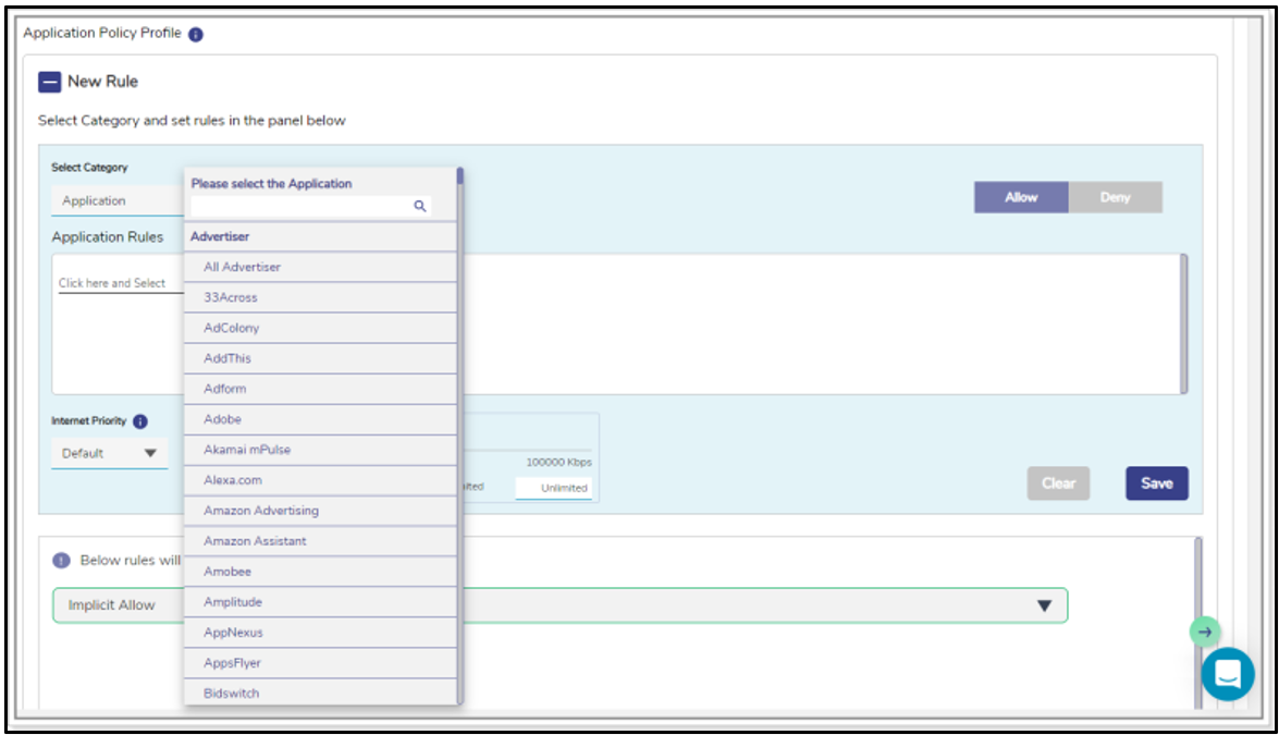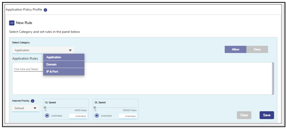The allowed and blocked application becomes available, see Figure Application Allow or Deny. There can be a single deny and single allow rule per category or an implicit allow or an implicit deny rule. If user selects the Application Rule in the Select Category field, then the Application Rules field becomes available. |