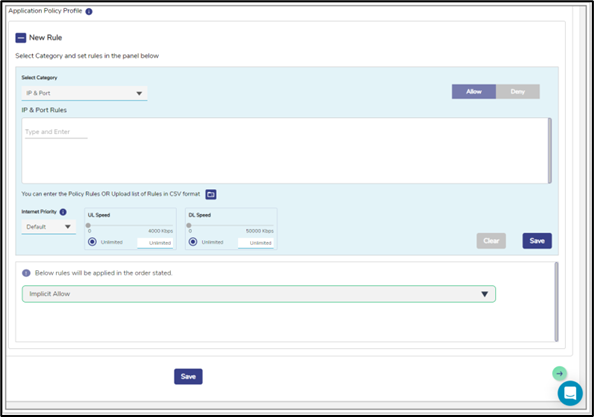 | If the user selects the Domain category, then the Domain Rules field becomes available, see Figure Domain Rules. Or, If user selects the IP & Port category, then the IP & Port field becomes available. In addition to this, the entire categories are by default, Allowed. Therefore, by default, Implicit Allow rule becomes available under the Application Policy Profile section. User cannot modify the Implicit Allow rule. |