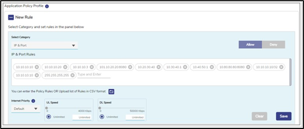 The allowed and blocked IP and the port become available. If user selects IP & Port in the Select Category field, then the IP & Port field becomes available. |