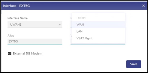 Select the Interface Type as WAN from the drop down, see Figure Interface - EXT5G.