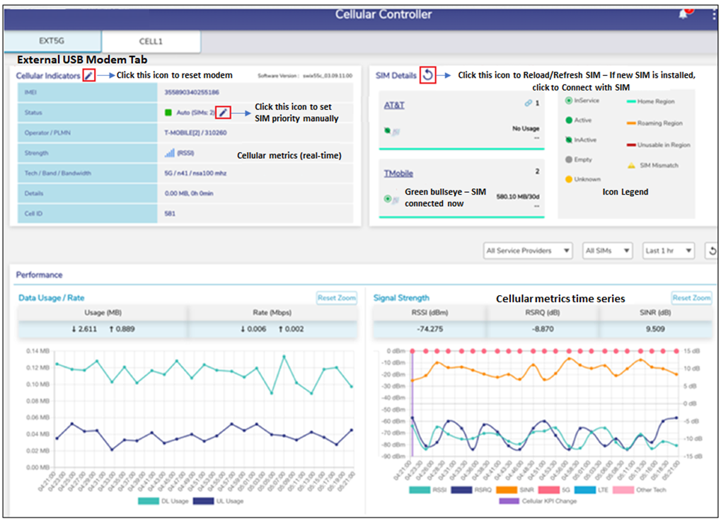 Once the Ext5G is configured on the EpicOS System, user can view analytics from the modem.