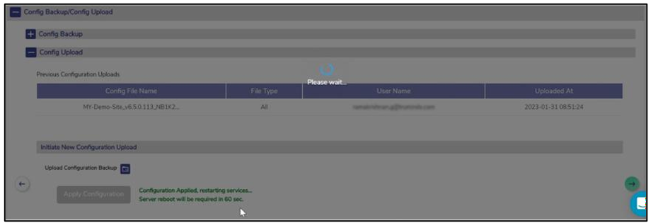 icon under the Initiate New Configuration Upload heading. Select a configuration from the list of backed up configurations. The selected configuration will appear next to the upload icon, see Figure Upload Configuration.Click Apply Configuration button. The configuration upload will be initiated and will take a few minutes, see Figure Apply Configuration. Once configuration is applied, the services will be restarted and corresponding message will be visible, see Figure Apply Configuration Intermediate Step. The uploaded configuration will also be visible in the Uploads table. The last step will be to reboot the server to apply the configuration, see Figure Apply Configuration Reboot Server.