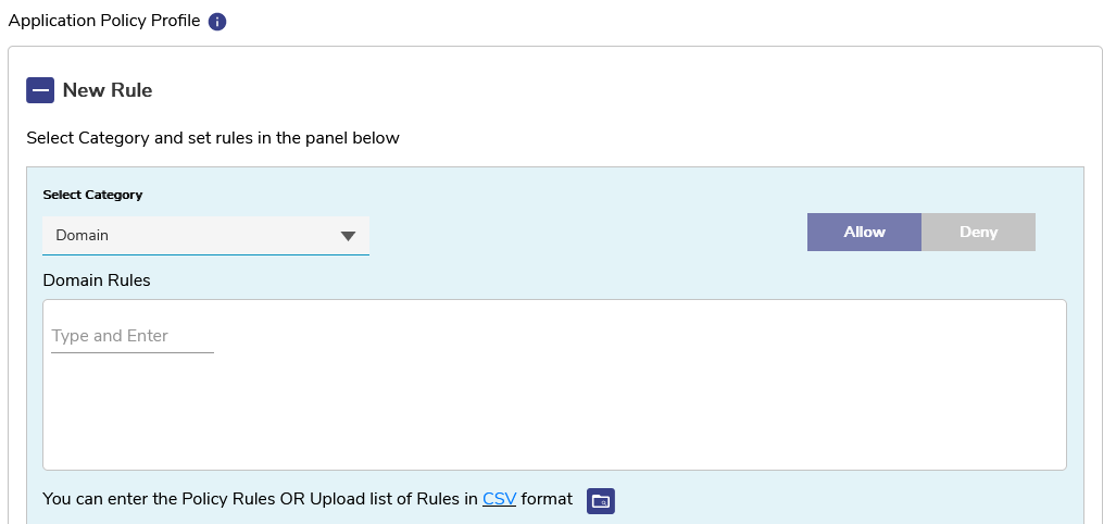 For Application Policy Profile - user can download the sample template for Domains and IP/Ports. They can edit the template with configuration and use the upload option to complete the configuration