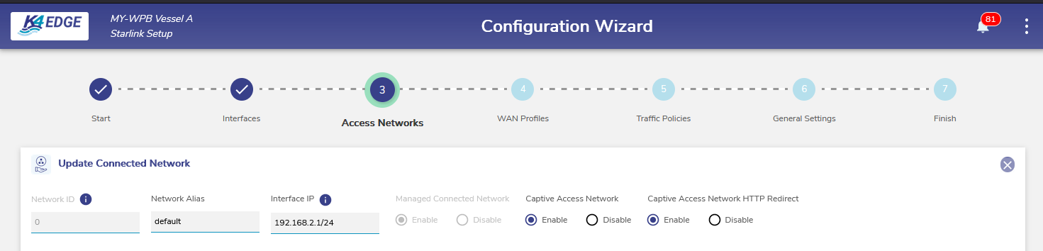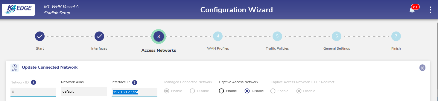 With dual starlink (maritime), both the terminals come up with the same network and gateway address causing IP conflict. In prior releases this was addressed just for starlink/VSAT-LEO interface. The same functionality is extended for other WAN interfaces as well, with the default option of being enabled only for VSAT-LEO. This option can be editable by clicking the gear icon against that interface in the Configuration Wizard. Virtual IP can be configured for any Ethernet based interface or sub interfaces. It won’t be applicable for in-build interfaces like Cellular or WiFi.