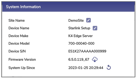 The user can view and edit system details such as Site Name, Device details, Firmware details. Additionally, it is possible to upgrade the firmware through this Pop-up.