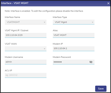 Click on the Toggle icon and disable the VSAT/MGMT Interface.