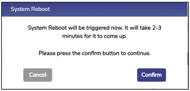 Click the Reboot icon. A confirmation Pop-up will be available, see Figure Reboot Confirmation. Click Confirm to reboot the server. Once the server comes up, the configuration will be uploaded on the system.