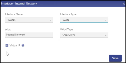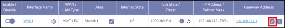 Click the Pencil icon under the Gateway Address column of the selected interface. The VSAT – LEO Type dialog box opens.