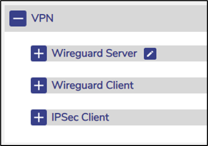 At this point it is possible to access configuration of the EdgeServer as a Wireguard VPN Server or VPN Client, expanding each via the corresponding '+'. The following sections will define the primary sequential steps to configure a Wireguard VPN between two EdgeServer devices.