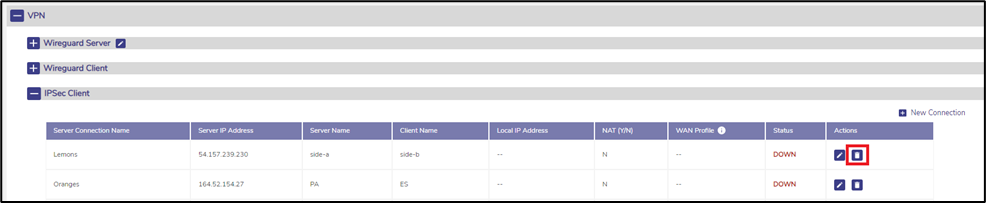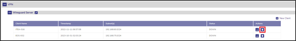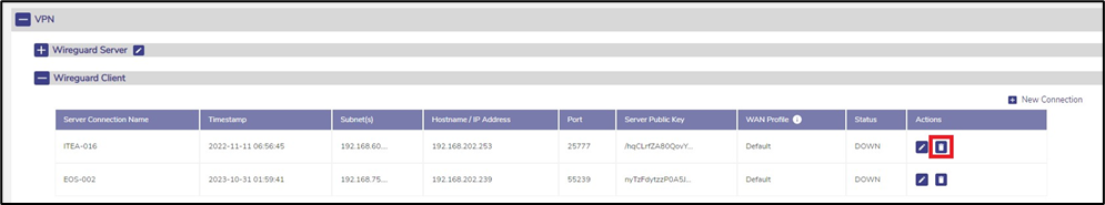 To delete a Wireguard VPN client connection, click on the Delete icon on the entry. At this time, it is not possible to edit a client connection - the connection must be deleted and re-created.