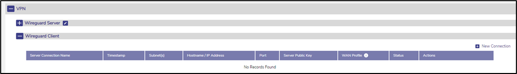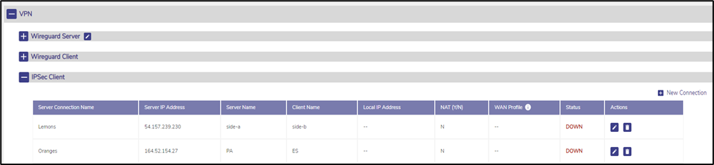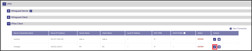 Hover the cursor on the icon given to the left of the Connection Name under the VPN Client section to view the type of VPN connection (Wireguard/IPSec).