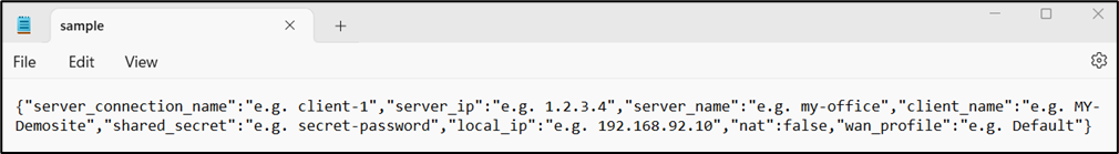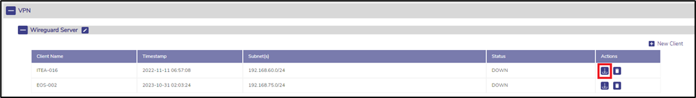 To allow for Wireguard VPN Client configuration on the remote EdgeServer, download the VPN Client ‘profile’. This is done by clicking the ‘DOWNLOAD’ folder icon for the created VPN connection. The downloaded profile will be used to configure the Wireguard VPN client connection on the remote EdgeServer. The VPN Client profile download will take the Alias Name “.json” at the end; for the example below test.json would be the default name.
