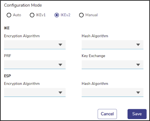 The user must then enter the details of the algorithms to be used for the IKE Phase (also called ‘Phase 1’) and ESP (also called ‘Phase 2’). Select the correct algorithms from the drop downs. Note that the PRF drop down allows a None option.
