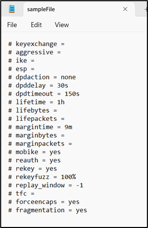 If none of the above Configuration Mode works, there is an option for a Manual mode of configuration, wherein a configuration file snippet (consisting of ‘<whitespace> <name> ‘=’ <value> entries in the StrongSWAN ‘ipsec.conf’ configuration file format) may be specified. Choose Manual mode to do it.