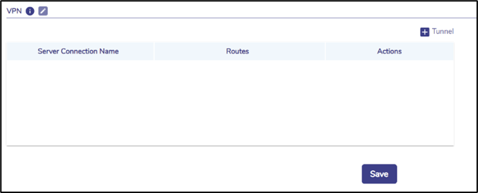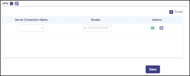 Click + Tunnel button to associate any route with any configured VPN connection – route ‘0.0.0.0/0’ is the ‘default’ route. Multiple such routes may be defined – making ‘split tunnel’ configuration possible. Any route not caught by this table will be routed over the default routing of the EdgeServer using the WAN Profile configured.