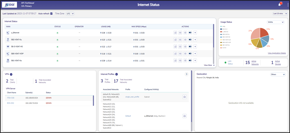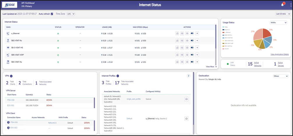 An overall view of the VPN status can be obtained from the EdgeServer Web UI Internet Status screen, as shown below. The VPN status can be seen at the bottom left of the screen. A VPN Server section will be present if there is at least one client connection configured. Likewise, a VPN Client section will be present if there is at least one server connection configured.