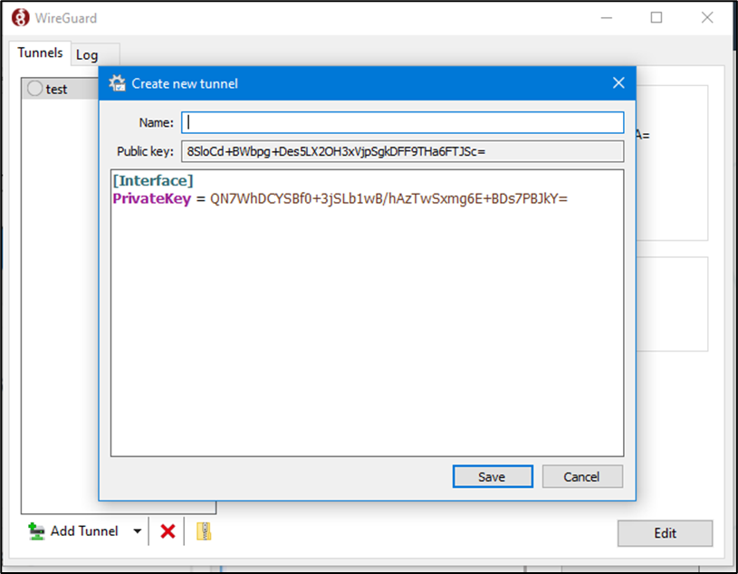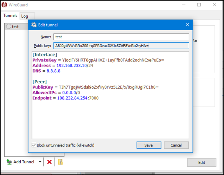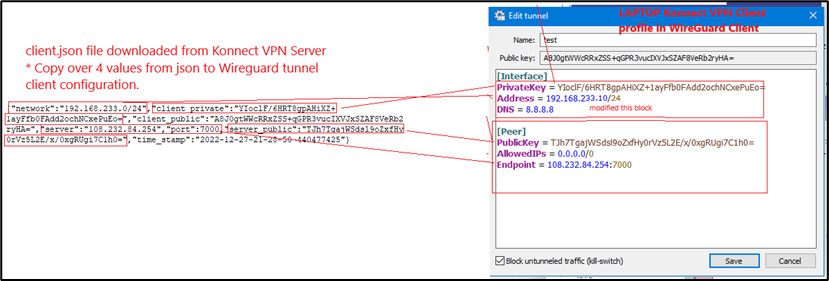 Address -> Utilize network value from the client.json – this was defined on the EdgeServer Wireguard VPN server.