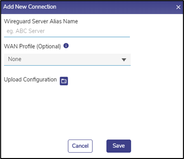 Then click on the ‘Upload Configuration’ folder icon, and select the recently downloaded Wireguard VPN Client profile file (server_alias.json).