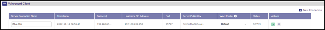 Only the Server Connection Name and WAN Profile may be changed. Once done, click the Green tick button.